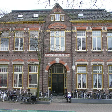 De bakstenen gevels worden afgesloten door een geprofileerde bakgoot op gesneden klossen met daar aansluitend decoratief oranje-rood metselwerk als aanduiding van een fries. Ter hoogte van de bovendorpel van de verdiepingramen bevindt zich een rondlopende band van paars verglaasde en gele baksteen. De dubbel uitgevoerde raamdorpels en de afdekking van de plint eveneens uitgevoerd in paars verglaasde steen. De vensteropeningen op de verdieping worden overspannen door een strek van oranje-rode steen met natuursteen aanzetblokken, op de begane grond door een natuurstenen latei waarboven een boogje is aangebracht; voorts ter hoogte van de onderdorpel en het kalf natuurstenen dagkantblokken. De kozijnen met kalf zijn voorzien van twaalf- respectievelijk acht-ruits bovenramen op begane grond en verdieping en onderramen met een vertikale deelroede en roedeverdeling langs de onderrand. Bij de verbouwing zijn een aantal onderramen tot stolpramen verbouwd. In de risaliet bevindt zich een rondboognis met entreepui, voorzien van een oorspronkelijke, dubbele houten deur met ruitjes en boven- en zijlichten in rondboogvorm. Boven de entreenis respectievelijk een opschrifttableau "St. Jacobusschool", een drielichtkozijn op de verdieping en drie kleine ramen met hoger middenraam in de top. Boven het middelste raam bevindt zich een rood-zwart metselwerkmozaïek en een sierlijk ijzeren gevelanker. Aan de Stalstraat bevindt zich een nevenentree met een dubbele deur met ruitjes onder een houten luifel en daarboven een drielicht bovenlicht onder een opgebogen, natuurstenen latei. Nabij de vooruitspringende gevelpartij een entree onder een getoogde latei met enkele deur, voorzien van een ijzeren raamhekje in Art Nouveau. Boven deze entree een rond glas-in-lood raam.