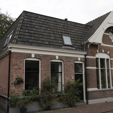 Eén bouwlaag tellende SCHOOL opgetrokken in bruine baksteen opeen rechthoekige plattegrond onder een met grijze Friesepannen gedekt overstekend zadeldak. Het pand is horizontaalgeleed met witte sierbanden en een lekdorpel onder de vensters.