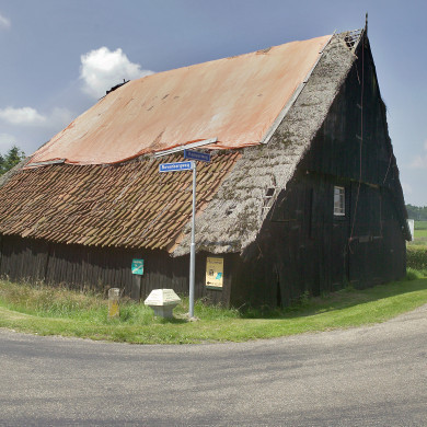 Aantrekkelijk gelegen complex bestaande uit een boerderij onder rieten schilddak met onderschoer en een streek eigen schuur onder rieten schilddak met in een van de lange zijden een dakkapel-vormig uitgebouwde inrit.