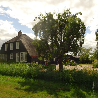 Houten boerderij van twee bouwlagen op nagenoeg vierkante plattegrond. De boerderij is van een ongewoon type en lijkt nog het meest op een stolpboerderij. In de huidige situatie bestaan de gevels uit brede houten delen in potdekselwerk boven een bakstenen, gepleisterde plint. Aan de voorhuiszijde zijn de gevels aan de binnenzijde voorzien van een in rode baksteen opgetrokken muur die aan de binnenzijde is gepleisterd. De boerderij heeft een soort tentdak met aan de zij- en achterkant tot de hoogte van een bouwlaag doorlopende dakschilden. Aan de voorzijde heeft het dak een wolfeind. Het dak is met riet gedekt; ter plaatse van de langsdakschilden, aan de onderrand twee rijen rode hollandse pannen. Op de nok en in het rechterdakvlak een gemetselde schoorsteen. De voorgevel heeft twee bouwlagen en een symmetrische indeling. Centraal een terugliggend, gesloten deel met een klein venster en kelderraam met diefijzers. Links en rechts daarvan twee maal drie schuifvensters. Op de verdieping drie schuifvensters. Alle vensters zijn uitgevoerd in hout en recht afgesloten. In de zij- en achtergevels diverse raam- en deuropeningen, met moderne kozijnen. Het interieur heeft nog de oorspronkelijke indeling met een woonhuis en een bedrijfsgedeelte. De delen worden gescheiden door brandwerende stenen muren. Gebintconstructie, balklagen en vloeren zijn nog aanwezig.