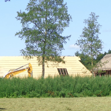 Van het haaks geplaatste bedrijfsgedeelte zijn de zijgevel aan de woonhuiszijde (W) en de kopgevel opnieuw opgemetseld. Verder bestaat dit bedrijfsgedeelte uit hout.
