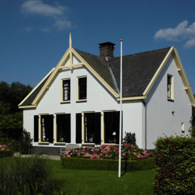 BOERDERIJ 'BOOMRIJK' MET ZOMERHUIS EN TOEGANGSHEK. Aan het zandpad staat een witgepleisterde boerderij van het langhuistype, oorspronkelijk gebouwd als buitenhuis in 1833. Verbouwing voorhuis en aanbouw stal in 1917.
