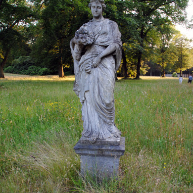 TUINBEELD FLORA. Voor het hoofdgebouw staand marmeren tuinbeeld voorstellende de figuur Flora staande op een rechthoekige sokkel. Vervaardigd in de achttiende eeuw.