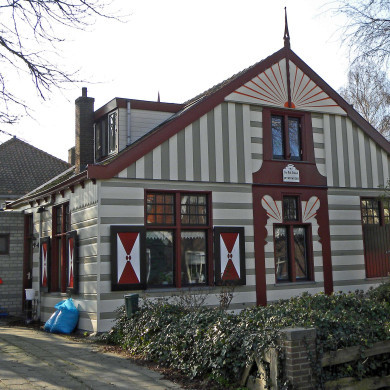 Onderwijzerswoning In 1897 op een rechthoekig grondplan ontworpen onderwijzerswoning onder zadeldak met rode pannen en met één bouwlaag en kapverdieping en opgetrokken in hout. De gevels zijn voorzien van liggend beschot met afwisselend wit en smallere lichtgroen geschilderdedelen. In de licht uitkragende topgevels zijn de verticaal geplaatste delen te weerszijden van het middenveld van gelijke breedte. De oostgevel bevat in het midden de voormaligetoegangspartij (tegenwoordig een dubbel draairaam) met zesruits bovenlicht, omgeven door een rood geschilderde omlijsting met geprofileerde rand; in de klaverbladvormige zwikken drie oranje-rode radiaal groeven. De kapverdieping bevat in het midden een tweelicht in aan de onderzijde uitzwenkende omlijsting, voorzien van plaquette met tekst 'Chr. Nat. School De Wegwijzer'. Te weerszijden bevat het middenveld liggend beschot. Hierboven een driehoekig voorschot met in rood-oranje geschilderde zonnestralen en geschulpte middenstijl, bekroond door gesneden topmakelaar met ruitvormig oog. Aan weerszijden een gekoppeld venster met luiken met roodwitte zandloper met knoop en elk negenruits bovenlichten. In het midden van de zuidgevel een zelfde vensterpartij als in de voorgevel. Over de gehele breedte van deze zijgevel onder de overstekende gootlijst op klossen een gekarteld latten-fries. De oostgevel is vrijwel blind en bevat eveneens gekarteld latten-fries en goot op klossen; voorts later aangekapte aanbouw.