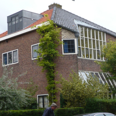 Het grote ateliervenster op de verdieping gaat hoog op in de kap. Het schilddak volgt aan de voorzijde het vooruit- en terugspringen van de onderliggende verdiepingen.