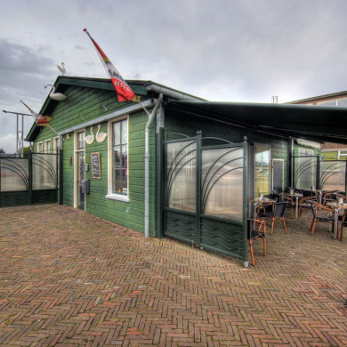 De oostelijke zijgevel heeft één houten vierruits venster en een dubbele opgeklampte deur.