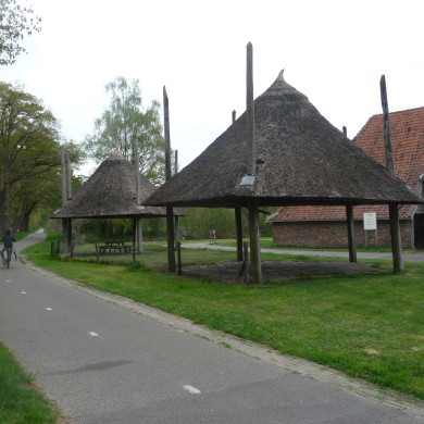 Twee vijfroedige HOOIBERGEN onder een rietgedekt tentdak met pluim.