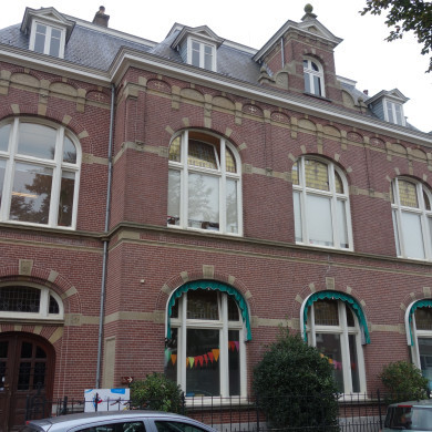 INTERIEUR. Tochtportaal met dubbele tochtdeur voorzien van zij- en bovenlichten op hardstenen neuten en onderdorpel. Gangen met een granito-vloer voorzien van sierranden; lambrisering met marmeren plint, gele en gebroken wit geglazuurde steen aan bovenzijde afgezet met marmeren rand. In hoek geplaatste hardstenen waterplaats. Hardstenen trap voorzien van giet- en smeedijzeren spijlen (M. Boddendijk Smid Meppel) afgedekt door eiken leuning. Grenen paneeldeuren met omlijsting en ruimte voor naamplaatjes aan bovenzijde. Trappenhuis met glas-in-lood ramen.