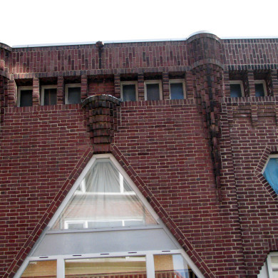 De centrale entreepartij met iets taps toelopend bovenlicht is bij de renovatie verbouwd. Boven deze entree een 6-hoekig raamkozijn. In de rechter travee een sober raamkozijn en een entreedeur met bovenlicht, geaccentueerd door verticaal metselwerk in de plint en een band op halve hoogte van de gevel. Op de verdieping een gemetseld blind veld met een halfronde, uitgemetselde decoratie waarboven een vlaggenstokhouder is aangebracht. Het pand is voorzien van een plat dak.