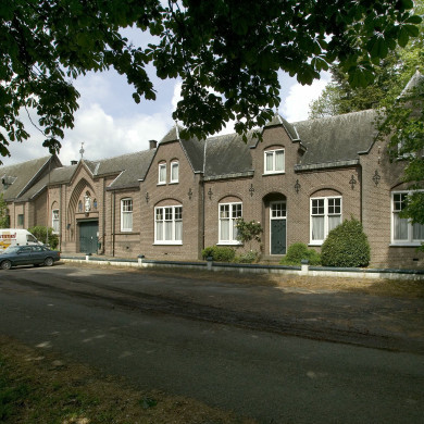 De centraal gelegen doorrit is tussen lisenen geplaatst onder een steekkapje met windwijzer. De dubbele inrijdeuren met beslag bevinden zich onder een ijzeren latei en binnen spitsboogvormige archivolten. Boven de deur een beeld van de aartsengel Michael met de draak, wapenschilden en een Latijnse spreuk. Aan weerszijden van de entreepartij een venster met achtruits bovenlicht onder een spitsboog spaarveld. De risalerende bouwdelen onder doorlopende dakschilden aan weerszijden van de poort vormen de overgang naar de daarnaast gelegen bouwvolumes. In het rechter risaliet is een venster met achtruits bovenlicht geplaatst, in het linker een rechthoekig venster met glas-in-lood vulling. Het rechter bouwdeel bestaat uit twee risalerende bouwdelen onder afgewolfde steekkapjes. Op de begane grond is in ieder risaliet een drielichts venster onder een gemetselde segmentboog geplaatst, op de verdieping bevinden zich twee kleine vensters. Tussen beide risalieten een bouwdeel met een verhoogde middentravee, eveneens onder een afgewolfde steekkap. Hierin is de entree in een segmentboogvormig portiek geplaatst, daarboven twee kleine vensters. Aan weerszijden van de entree een tweelichts venster onder een gemetselde segmentboog. De zes traveeën brede kapel links van de poort wordt door middel van lisenen onderverdeeld. In vijf traveeën is een rechthoekig venster met glas-in-lood geplaatst, de laatste travee heeft een moderne uitbouw. Op het dak twee dakruiters.