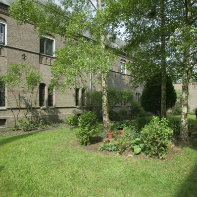 Ten westen van het kloostergebouw een vrijstaand, langgerekt DIENSTGEBOUW met aan de noordelijke zijde een dwarsgeplaatst bouwdeel bestaande uit verschillende dienstruimtes opgetrokken in rode machinale baksteen onder een met muldenpannen gedekt zadeldak. In de voorgevel (O) zijn T-vensters geplaatst en enkele deuren. Via een doorgang kan men de achterzijde bereiken. In de achtergevel zijn overwegend tweelichts vensters geplaatst.