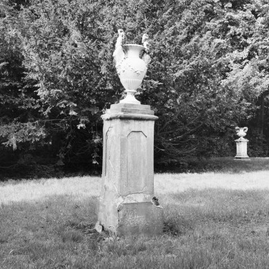 Tuinvaas op sokkel, staand ten noordoosten achter de woning, tegen de bosrand. De vierkante ijzeren sokkel is rijk geornamenteerd met onder meer draken en kopjes en wordt bekroond door de metalen vaas.