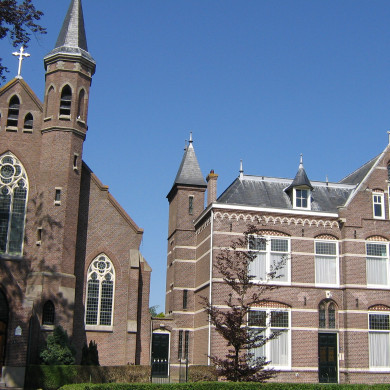 Pastorie van de aangrenzende Rooms Katholieke kerk, in 1905 in overgangs-architectuur gebouwd naar ontwerp van C.P.W. Dessing.