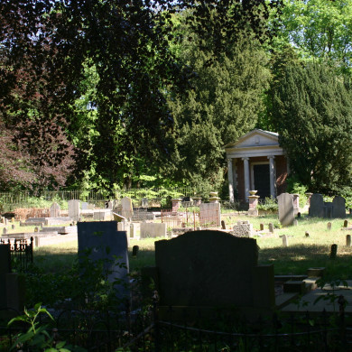 De beplanting is sober en omvat enkele beuken en de genoemde coniferen. Om de graftempel is een beplanting bestaande uithulst en andere heesters aangebracht.