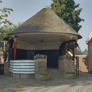 MUZIEKTENT, gebouwd in 1926 naar het ontwerp van H.F. Symons in de stijl van de Amsterdamse School en gesitueerd op de open ruimte op de zuidhoek van de Torenlaan en de Dorpsstraat.