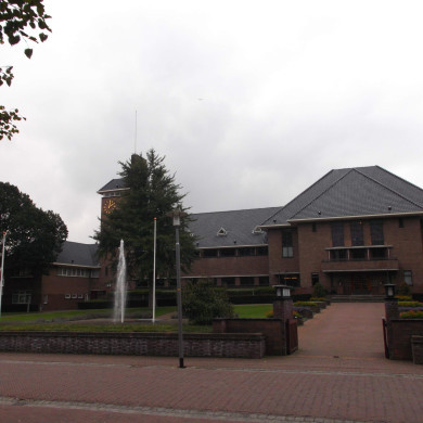 Het samengesteld bouwlichaam van het GEMEENTEHUIS heeft een onregelmatige L-vormige plattegrond en telt twee bouwlagen en kapverdieping boven het sousterrain. Het samengestelde schild-zadeldak met overstekken is gedekt met zwart verglaasde kleine Romaanse pannen. De gevels zijn tot de waterdorpels van de begane grondvensters opgetrokken in een paarsrode baksteen van Hilversums formaat en daarboven in geelbruine baksteen van hetzelfde type in Vlaams verband. Rechtgesloten gevelopeningen met (deels samengestelde) stalen vensters en glasdeuren onder betonnen lateien en luifels met een gefrijnde voorkant. De dagkanten van de gevelopeningen in de voorgevel zijn bekleed met roodbruine tegels en een decoratieve rand van wit en blauw geglazuurde tegels. In de trouwzaal, de raadszaal en het trappenhuis gebrandschilderde glas-in-loodramen met figuratieve voorstellingen. De voorgevel (noord) wordt gedomineerd door het hoge naar voren springende bouw volume met ingangsrisaliet onder steekkap. Een trap van zes treden leidt naar de dubbele houten glasdeur met decoratief bronzen traliewerk. De deuren worden geflankeerd door twee in terracotta uitgevoerde heraldische leeuwen. Boven de ingang een ver overstekend breed gemetseld balkon en drie dubbele stalen balkondeuren met glas-in-lood onder een doorlopende betonnen latei. In de drie grote traplichten boven de latei gebrandschilderd glas. Aan weerszijden van de hoofdingang twee stalen deurpartijen onder betonnen luifels die via gemetselde bordessen met bloembakken toegankelijk zijn. Op het linker bordes een (vernieuwde) lantaarn. In de voorgevel van de trouwzaal drie vensters met glas-in-lood bovenlichten onder een doorlopende betonnen latei. De voorgevel van het kantoorgedeelte wordt geleed door horizontale reeksen van acht stalen vensters, op de begane grond onder doorlopende betonnen latei en op de verdieping onder overstekende daklijst. In het dakschild vier kleine driezijdige dakkapellen. De tor en heeft een rechthoekig grondplan onder overstekend schilddak, aan één zijde geflankeerd door een hoge schoorsteenpartij. In de toren vier kleine trapsgewijs geplaatste glas-in-loodvensters en onder de kap een samengesteld hoekvenster. Op de noordoost- en zuidwestzijde van de toren is het torenuurwerk gesitueerd. Ook de achtergevel (zuid) van het gemeentehuis wordt gedomineerd door het verhoogde bouwlichaam, waarin zich op de verdieping de raadszaal met balkon bevindt. Onder het balkon een bordes met twee trappen waarop twee stalen deurpartijen uitkomen. De gevel van de raadszaal telt vijf vensters en twee balkondeuren met gebrandschilderde glas-in-loodramen. De achtergevel van de trouwzaal bevat drie draairamen tussen muurdammen in rode baksteen. Onderin deze gevel een entree naar het souterrain. In de achtergevel van het kantoorgedeelte souterrainvensters met roedenverdeling en een uitkragende verdieping op betonnen latei. Grote vensters met samengestelde stalen kozijnen op begane grond en verdieping. In het schilddak van het hoge bouwvolume kleine puntvormige dakkapelletjes. In de voormalige bodewoning zijn de oorspronkelijke stalen vensters vervangen en resteert een oorspronkelijke houten deur links van de traptoren.