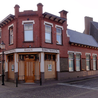 De entree van de winkel aan de noordwestzijde wordt geaccentueerd door een afgeschuinde hoek aan de zijkanten omlijst door een muizetandlijst die eindigt in een boven het dakvlak uittorende bakstenen pijler; houten paneeldeur waarin glas met halfronde zijlichten met bovenlichten; koperen railing. Aan weerszijden van de afgeschuinde hoek een etalageraam omlijst door betonnen gedecoreerde pilasters onder een betonnen latei, waarop geschilderd `Banketbakkerij H. Koenen Banketbakkerij'. Boven de entree en etalagevensters H-vensters.