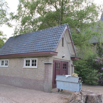 De VOORGEVEL bevat dubbele paneeldeuren met een zelfde profiel als in de voordeur van de pastorie, maar de dubbele deuren zijn voorzien van 2x2 ruiten met beneden een ventilatieroostertje. In de LINKER ZIJGEVEL zijn aan weerszijden van de middenas onder de daklijst tweemaal twee gekoppelde vierruits ramen, voorzien van een kruiskozijn gesteld.