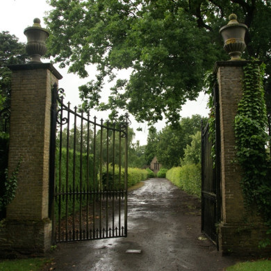 Toegangshek bestaande uit twee zware kolommen, opgetrokken uit gele baksteen en afgedekt door een hardstenen plaat waarop een hardstenen urn. Tussen de kolommen is een tweedelig smeedijzeren toegangshek aangebracht.