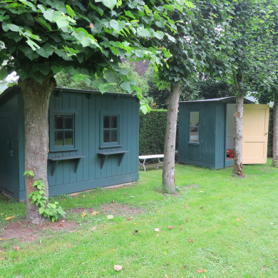 KINDERHUISJE (B). KINDERHUISJE uit ca. 1890. Het huisje op vrijwel vierkante grondslag is opgetrokken uit verticale houten delen en wordt afgedekt door een thans (1996) met bitumen bekleed licht getoogd dakschild. Het dak is voorzien van een overstek dat aan de voorzijde van een geschulpte rand is voorzien. In de voorgevel bevindt zich een houten deur en in de linkerzijgevel een 5x2-ruits venster. Het interieur is wit geschilderd. Het kinderhuisje staat thans naast het andere speelhuisje (A), in het tuingedeelte tussen het voorplein en de "lage tuin", de zgn. "lindentuin".