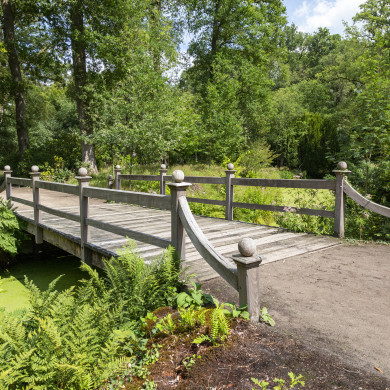 Eenvoudige, onbewerkte houten BRUG uit ca. 1922, gelegen over de beek ten westen van zgn. "wilde tuin". De brug heeft houten keermuren en de beek is hier voorzien van een beschoeiing van planken en larixpalen. De balustrade aan weerszijden van het uit balken opgebouwde brugdek bestaat uit zes eenvoudige houten balusters voorzien van een geprofileerde dekplaat en een bol, onderling verbonden door planken. De buitenste, lagere balusters zwenken wat naar buiten uit.