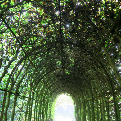 Lange, flauw S-vormige CHARMILLE uit ca. 1922, thans (1996) begroeid met Fagus Sylvatica, gelegen ten westen van de zgn. "tennistuin". Bij de charmille ligt een rond stenen KOMMETJE (met een binnen- en buitenrand van baksteen waartussen bakstenen scheidingen zitten en waarin o.a. hosta's en varens groeien) en een fontein. Het kommetje wordt van water voorzien door de drukketel in het bouwhuis, waarbij gebruik wordt gemaakt van een eigen bron. De kom accentueert het begin van de uit vier delen bestaande charmille, die ca. 60 meter lang is, uit 28 bogen bestaat en vanaf de kom naar de "tennistuin" loopt. Toen omstreeks 1970 de aldaar gelegen tennisbaan werd verwijderd, werd het bestaande gedeelte van de charmille doorgetrokken en kreeg de huidige lengte. Ten westen van de kom staat een korte (4 bogen) gebogen charmille. Ten zuiden en noorden staan 2 bogen, met onder het zuidelijke deel een houten, groen geschilderde TUINBANK met in de rugleuning een hartje. Deze bank werd in 1913 voor de rozentuin gemaakt. Naast het prieel in de "tennistuin" staan vervolgens nog eens 2 bogen. De charmille is opgebouwd uit regelmatig van elkaar geplaatste in de grond verzonken betonnen voeten waarop ijzeren T-profiel-bogen rusten. De bogen zijn onderling verbonden met stevige ijzeren L-staafjes, buizen en draden.