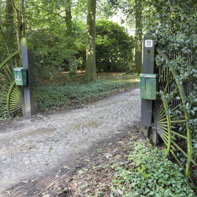 Aan de overzijde van de weg naar de boerderij De Berenpas staand TOEGANGSHEK uit ca. 1920 naar ontwerp van W.E. Gatacre, bestaande uit twee staanders met afgeronde toppen waartussen een draaibare vleugel van spijlen en regels die door een brede diagonaal worden verbonden.