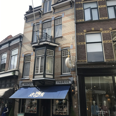 De winkelpui op de begane grond bestaat uit gemetselde muurdammen met daartussen twee rechtgesloten etalageruiten in houten kozijnen. Tussen de etalageruiten bevindt zich de ingang, een glasdeur met bovenlicht. Onder de etalageruiten zijn sierlijke smeedijzeren ventilatieroosters aangebracht. In de gepleisterde plint van de muurdammen basreliëfs. In de lijst boven de winkelpui zijn de woorden "wapen" en "fabriek" geschilderd.