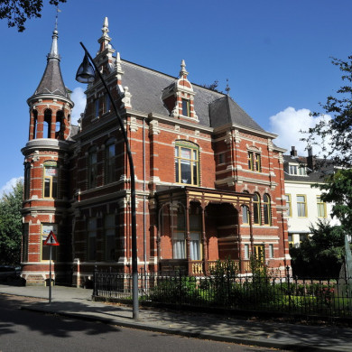 Het gebouw is opgetrokken op een vrijwel rechthoekige plattegrond over een souterrain en twee bouwlagen onder een afgeknot schilddak in Maasdekking. De gevels zijn boven een hardstenen plint opgemetseld in rode verblendsteen, met speklagen van kalkzandsteen en details in zandsteen en pleisterwerk. De rechtgesloten vensters zijn geplaatst onder hanekammen en segmentboogvormige boogtrommels, met aanzet- en sluitstenen, diamantkoppen en tegeltableaus. De traplichten worden door rondbogen afgesloten. Op de hoeken van de gevels en risalieten zijn pilasters met ionische kapitelen aangebracht. De veranda, erker en dakkapellen zijn voorzien van voluten. Andere toegepaste zandstenen decoraties zijn palmetten en rolwerk.