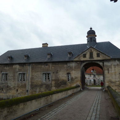 ad a.: poortgebouw, XVII-XVIII; rechthoekig gebouw, grachtzijde en korte gevels van mergel, voorpleingevel baksteen met speklagen van mergel; geknikt schilddak met leien; de poortdoorgang oostelijk van het midden in de voorgevel; in de doorgang op de muren links en rechts een geschilderde tekst: PAX HUIC DOMUI en NOBISCUM EST DEUS; boven de poort aan voorgevelzijde een driehoekig fronton met drie kleine ramen; daarboven een achthoekige dakruiter met uivormige dak; houten poortdeuren met hang- en sluitwerk, zeer waarschijnlijk naar ontwerp van Cuypers, XIXd. Ronde hardstenen schampstenen bij poortdeuren. Het poortgebouw sluit het voorplein aan de zuidkant af en is met het economiegebouw verbonden door een korte tuinmuur bekroond door een trapgevel; muur in mergel en baksteen; midden in de muur een rond houten poortdeurtje.