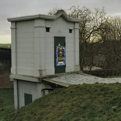 Het huisje is aan de voorzijde met de kruin van de dijk verbonden door middel van een overbrugging met twee betonnen verbindingsmuurtjes.