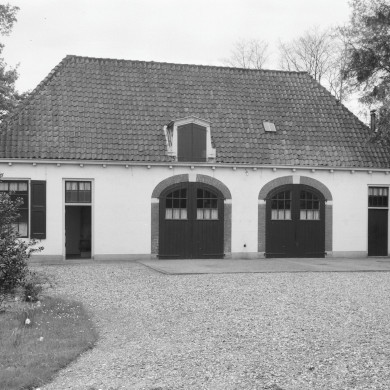 KOETSHUIS. Ter zijde van het hoofdgebouw een witgepleisterd koetshuis uit 1765 met aan de achterzijde een rechthoekige aanbouw van een dienstwoning uit ca.1924. Het pand bestaat uit twee haaks opelkaar geplaatste bouwmassa's van één bouwlaag onder een met rode en gesmoorde Hollandse pannen gedekt samengesteld dak. In de voorgevel twee getoogde dubbele inrijdeuren gevat in een bakstenen omlijsting met rechts daarvan een deur met meerruits bovenlicht en links daarvan een identieke deur en een meerruitsvenster met luiken. Centraal een dakkapel met dubbel luik dat driehoekig is afgesloten. De overige gevels kennen een symmetrische indeling van twaalfruits schuifvensters met luiken. Deur met bovenlicht. Gietijzeren dakvensters. Achter het koetshuis een houten brug (ca.1926) bestaande uit een houten loopplank op houten staander met een balustrade van stammetjes.
