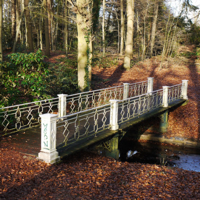 Een over de slingervijver gelegen BRUG met smeedijzeren hekwerken die tussen vier houten pijlers op uitkragende basement zijn gezet. De houten pijlers hebben een vierkante grondvorm. Elke zijde van de pijler heeft een gelijke invulling/decoratie bestaande uit een verdiept liggend paneel of casement waarop een ruitmotief is gezet. De pijlers worden afgesloten door een geprofileerde lijst waarboven een dekplaat is bevestigd. De smeedijzeren hekwerken zijn opgebouwd uit drie regels, twee aan de bovenzijde en één aan de onderzijde, die met de pijlers verbonden zijn. Tussen de regels zijn ruit- en krulvormige elementen gezet. De vernieuwde vloer van de brug bestaat uit planken.