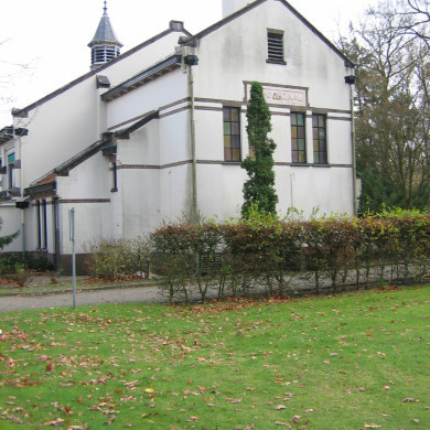 Vrijstaande GEHOORZAAL op samengestelde plattegrond van één bouwlaag, onder zadeldak met rode kruispannen gedekt en met de nok evenwijdig aan de weg.
