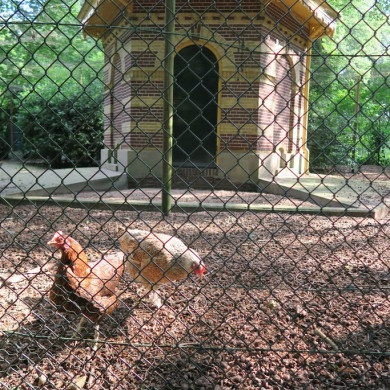 Een uit baksteen opgetrokken KIPPENPALEIS van één bouwlaag, op zeshoekige plattegrond onder een met bitumen gedekt tentdak met overstek, dat op de hoeken door schoren met ajourwerk ondersteund wordt. De gesneden daklijst is van recente datum. De gevels zijn opgetrokken uit rode baksteen in kruisverband en zijn opgesierd met horizontale banden en een zaagtandlijst van geel baksteen die aan elke zijde onderbroken wordt door een verdiept liggend rondboogveld. In drie van deze velden is aan de bovenzijde een rondvenster gezet met een vierpas-roeden motief, dat omvat is door een rollaag. Twee velden zijn blind, terwijl in één veld aan de noordzijde een rondboogvormige houten deur is gezet. Achter deze deur bevindt zich een korte gang met houten wanden, waarin onderaan luiken zijn aangebracht om de gelegde eieren te kunnen pakken. Vijf velden hebben in de omgaande plint een kleine, getoogde ingang bestemd voor de kippen. Een uit geel baksteen gemetselde rondboogvormige strek sluit het veld af. Boven deze strekken is een omgaande muizetandlijst aangebracht, waarin zowel rode als gele baksteen is verwerkt. Om het kippenpaleis is een uit rode en gele baksteen gemetselde stoep aangebracht. Als gevolg van verzakking is op een aantal plaatsen een cementlaag aangebracht.