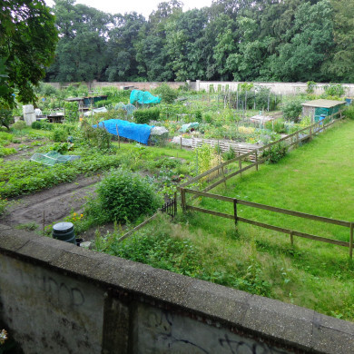 Even verder, aan de linkerzijde van het pad, bevindt zich in een opgeworpen heuvel een groentekelder. Weer ten noorden hiervan is een grote ommuurde, ovaalvormige moestuin aangelegd die tegenwoordig dienst doet als volkstuinencomplex. De uit baksteen opgetrokken muur wordt gekenmerkt door regelmatig geplaatste steunberen die zich aan de buitenzijde van de muur bevinden. De moestuin heeft drie ingangen: de hoofdingang bevindt zich aan de zuidwestzijde, twee kleinere ingangen bevinden zich aan de noordwestzijde en de zuidoostzijde. Vanuit de hoofdingang loopt een breed pad in zuidwestelijk richting naar de oprijlaan.