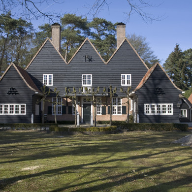 Het LANDHUIS is evenwijdig aan de Amersfoortseweg gelegen en heeft een rechthoekige basisplattegrond met twee uitbouwen aan de voor- of zuidzijde en één aan de achterzijde. Het pand telt één bouwlaag met een extra verdieping en zolder onder een drietal evenwijdig naast elkaar geplaatste overstekende en uitzwenkende zadeldaken en lagere zadeldakjes op de aanbouwen, allen met de nok haaks op de weg. De dakbedekking bestaat uit rode Hollandse pannen. Op de buitenste nokken bevinden zich twee schoorstenen. De topgevels zijn boven de geteerde trasramen opgetrokken in Vlaams verband en voorzien van rollagen. De topgevels en een deel van het muurwerk zijn betimmerd met gepotdekselde houten delen. Deze waren oorspronkelijk gecarbolineerd. Het pand is voorzien van stolpende vensters, meerlichtsvensters en kruiskozijnen die allen roedenverdelingen bezitten. De kruiskozijnen zijn voorzien van luiken met smeedijzeren gehengen en een beslag met dito klinknagels. Verder zijn onder andere de regenpijpen opvallend gedetailleerd.