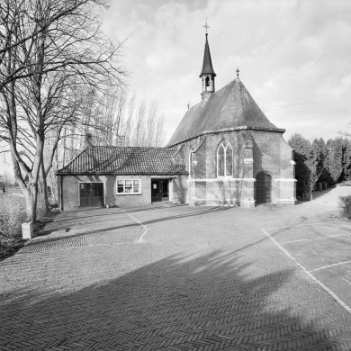 Het voormalige kerkgebouw van de Nederlandse Hervormde gemeente van Sleeuwijk, oorspronkelijk gebouwd als rooms-katholieke kerk, aan de voet van de dijk met de nok evenwijdig aan de dijk.