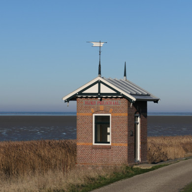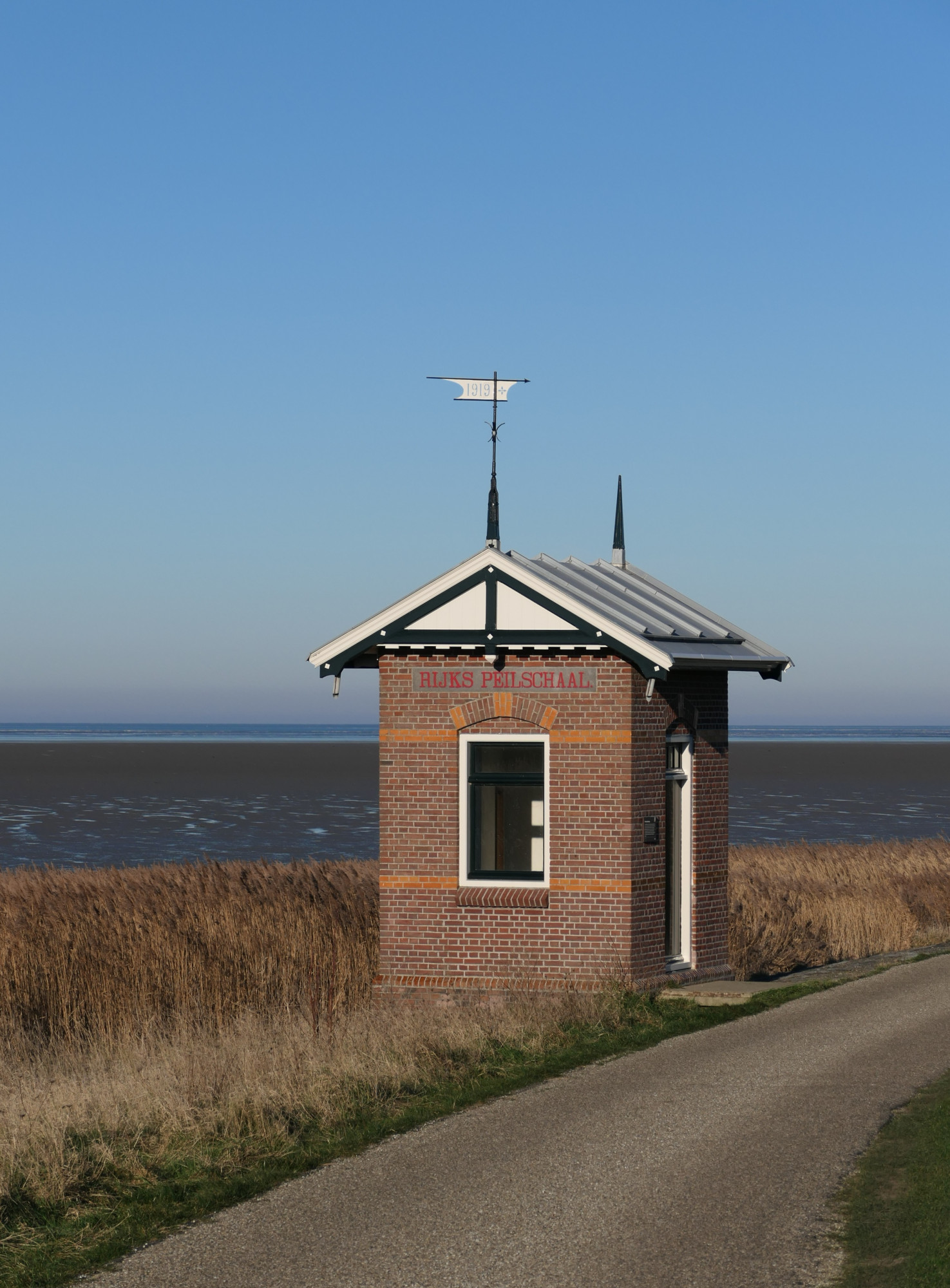Aan de noordzijde van het voormalige eiland Wieringen gelegen PEILSCHAALGEBOUW, daterend uit 1919. Het gebouwtje ligt tegen de noordzijde van de zeedijk, direct aan de Waddenzee.