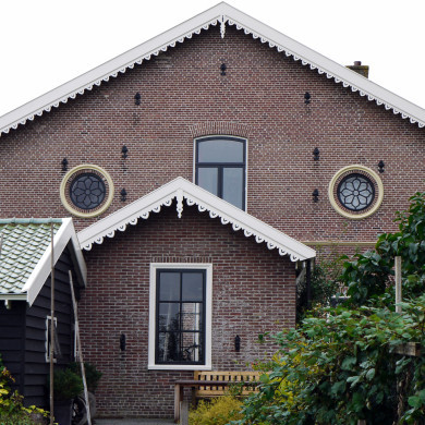 De voorzijde (O) heeft in het midden een spitsvormig drielichtsvenster, met Y-vormig profiel in hout.