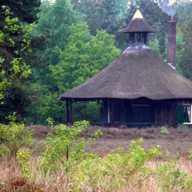 Octogonale houten THEEKOEPEL op houten podium, onder octogonaal met riet gedekt kegeldak. Het dak steekt ver over en wordt gedragen door kolommen waardoor rondom een veranda is ontstaan. Kolommen, schoorwerk en windverbanden van de veranda bestaan uit onbewerkte boomstammen en takken. Op het dak een opengewerkte lantaarn die eveneens met een rieten kegeldak bekroond wordt.