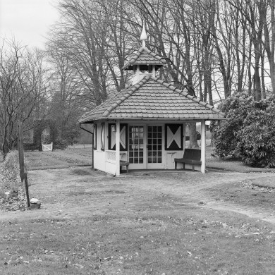 Houten THEEHUISJE op vierkante grondslag onder met tuile du Nord pannen bedekt schilddak met klokkestoeltje onder tentdak en spits midden op de nok. Voor het huisje een veranda. Aan de verandazijde en de achterzijde een dubbele meerruits glasdeur, aan de achterzijde met panelen in de onderkant. In de zijgevels meerruits draaivensters. Alle vensters en deuren zijn behangen met luiken.