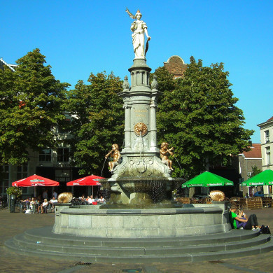 Ronde natuurstenen fontein, bestaande uit een bassin met op een basement een kom op consoles. Vanuit de kom rijst een kolom op met het beeld van de stadsmaagd, op een basement met schelpmotieven.