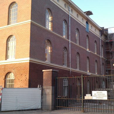 In de hoofdgevel aan de binnenhof (W) tussen de brandkeermuren een middenpartij over drie vensterassen met daarin de entree. Deze heeft een groot halfrond bovenlicht met een stervormige roedenverdeling. Aan weerszijden van de middenpartij acht vensterassen. In de oksels, voor de trappenhuizen van de vleugels, dezelfde entrees.