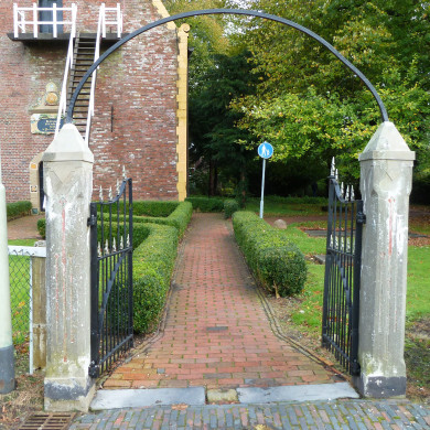 TOEGANGSHEK bij de kerk bestaande uit twee gepleisterde, gedecoreerde pijlers met een dekplaat met vierzijdige punt. Een gebogen stang verbindt de punten van beide dekplaten met elkaar. Tussen de pijlers twee beweegbare hekken met smeedijzeren regels en spijlen en gietijzeren punten.