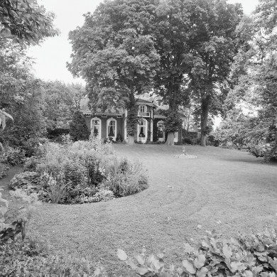 Entree bevindt zich in oostgevel; dubbele houten paneeldeur met voor vensters een geornamenteerd gietijzeren rooster heeft een bovenlicht dat beëindigd wordt door een korfboog; voordeur en bovenlicht zijn omlijst; boven omlijsting een eclectische ornamentering; drie treden hoge hardstenen stoep. Naast voordeur twee vensters. In topgevel een omlijst rondboogvenster met dubbele deur met venster; aan venster een houten balkon met gietijzeren balustrade en consoles; in topgevel een getrapte gevellijst van pleisterwerk en rijk geornamenteerde windveren. Zuidgevel heeft in het midden een driezijdige uitbouw die twee bouwlagen hoog is; in elke zijde van uitbouw op begane grond een korfboogvenster en op eerste verdieping een kleiner korfboogvenster met omlijsting; middelste venster op eerste verdieping heeft een dubbele deur met een zelfde balkon als aan oostgevel; uitbouw wordt gedekt door een schilddak; langs daklijst een rijk geornamenteerde ijzeren lijst. Aan weerszijden van uitbouw twee korfboogvensters. Westgevel heeft een dubbele terrasdeur met bovenlicht dat beëindigd wordt door korfboog; erboven een sierelement van pleisterwerk; naast dubbele deur een groot niet-origineel venster met deur. In topgevel een zelfde venster met balkon en een zelfde getrapte gevellijst als oostgevel.