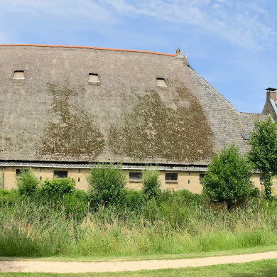 Op een omgracht terrein gelegen kop-rompboerderij met aangebouwde stelp, van algemeen belang