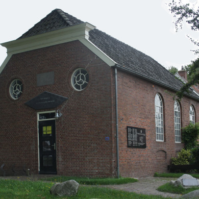 Synagoge opgetrokken in baksteen onder een afgewolfd zadeldak gedekt met oud hollandse pannen.