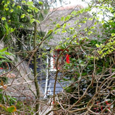 In de rechterzijgevel v.l.n.r. een opgeklampte deur, twee kleine vensters en een tweelicht venster met negenruits draaiende delen. In het dakschild een met riet bedekte dakkapel met een drielicht venster.