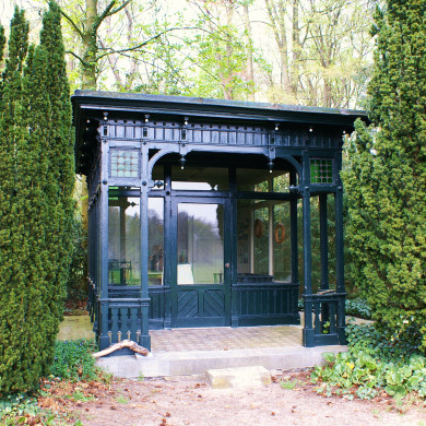 -Het eind-19de-eeuwse koetshuis/paardestal in chaletstijl, typerend voor het eind van de vorige eeuw.